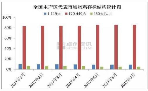 本月鸡蛋价格整体在成本线上下波动,行情弱势,仅在月底蛋价持续反弹,加上月内气温偏高,养殖单位补栏积极性不高,新开产蛋鸡占比增量较小,1-119日龄蛋鸡存栏环比涨幅0.22%,后备鸡情况仍处于低位,短线上游供应量难有明显增加。由于上半年养殖户淘汰老鸡数量较大,养殖户对中秋节前行情仍抱有较大希望,淘汰积极性较差,惜售心理浓厚,同时随着部分400-450日龄蛋鸡步入待淘期,本月450天以上老鸡占比环比增加2.04%,但占比仍不足5.00%,而120-450天在产蛋鸡环比略有减少,幅度在0.10%。综上所述,随着老鸡逐渐淘汰,而新开产蛋鸡量仍处于低位,450天以下在产蛋不乏仍有微幅减少可能。
